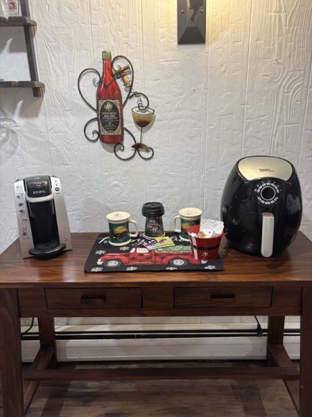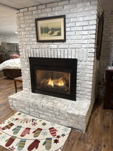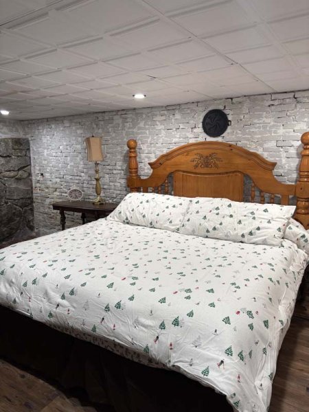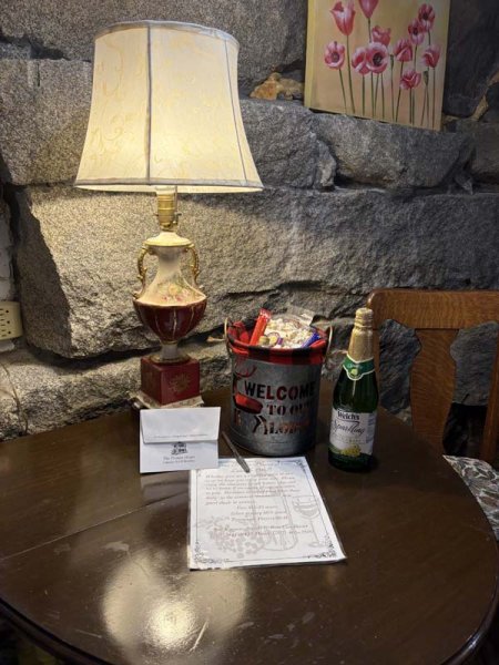 Down around the backside of the octagon facing the lake is the private entrance to the Granite Suite. This cozy suite has a fireplace in the living room and the walls are the original granite foundation of the home, which was built in 1850. This is a very unique room, some refer to as the "hobbit suite" due to the characteristics of the space.. The room was completed renovated in 2016 with new windows, carpets, ceiling and lighting. A king bed, queen sleeper sofa and private bath completes the setting.